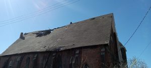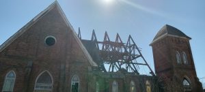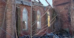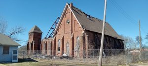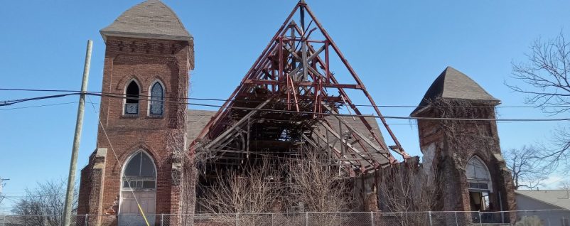 Regular services have not been held at Centennial Baptist Church for decades. Beginning in the early 1990s, work was done to stabilize the church, but a full restoration was never completed. In 2019, the building’s ownership changed, renewing efforts to save it. Unfortunately, on April 12, 2020, straight line winds severely damaged the church, pushing the front wall down and lifting the roof off of the sanctuary. It remains in this precarious state today. A structural assessment was completed in spring 2021, outlining recommendations to safely stabilize the structure, but funding remains an issue. Centennial Baptist Church was actually included on Preserve Arkansas’s 2006 and 2018 Most Endangered Places lists, and it is being included again to reemphasize the importance of the property and the urgent need for action to preserve what remains.